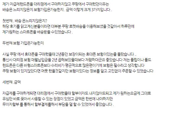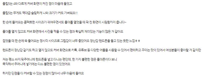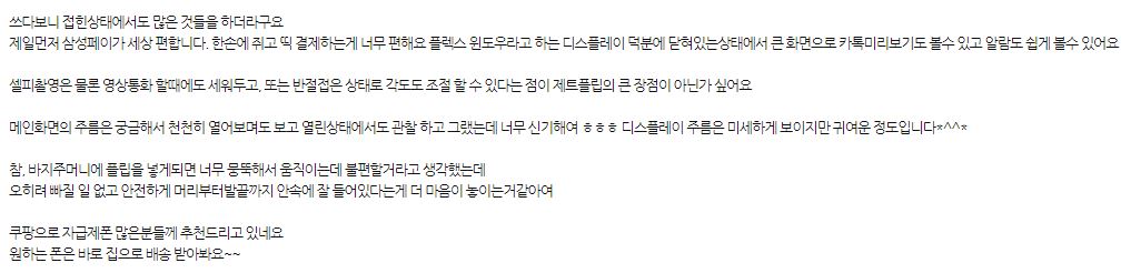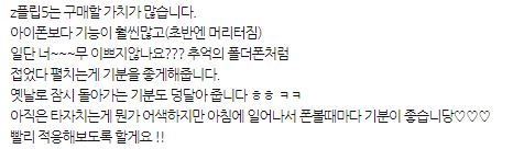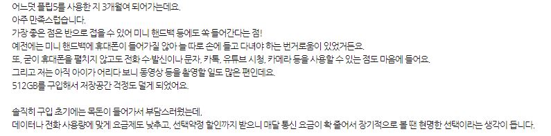 많은 분들의 만족도가 높았으며, 셀피촬영이나 플렉스 위도우를 통한 여러 가지 활용도도 높아 Z플립의 큰 장점이 되었습니다. 자급제에 대해서도 초기 비용 부담의 걱정이 있었지만, 통신사 할부와 요금제를 직접 비교해 봤을 때, 자급제의 장점이 더 있어 구매하기도 합니다.